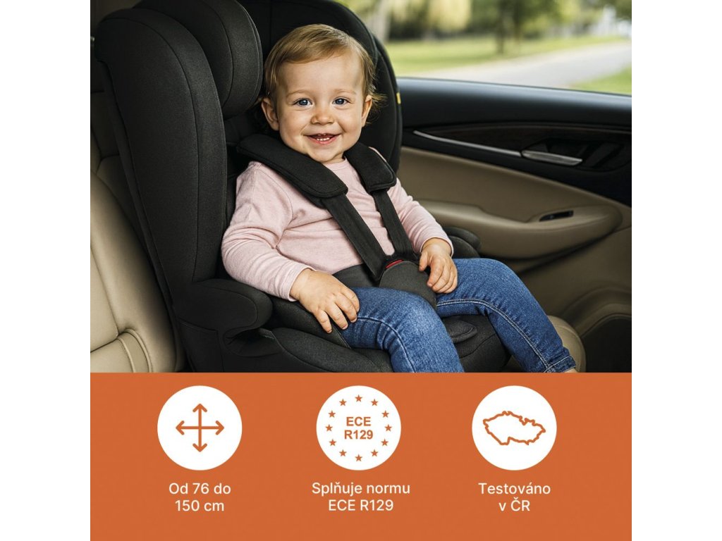 Splňuje normu ECE R129, roste s dítětem a poskytuje spolehlivou ochranu po celou dobu používání.