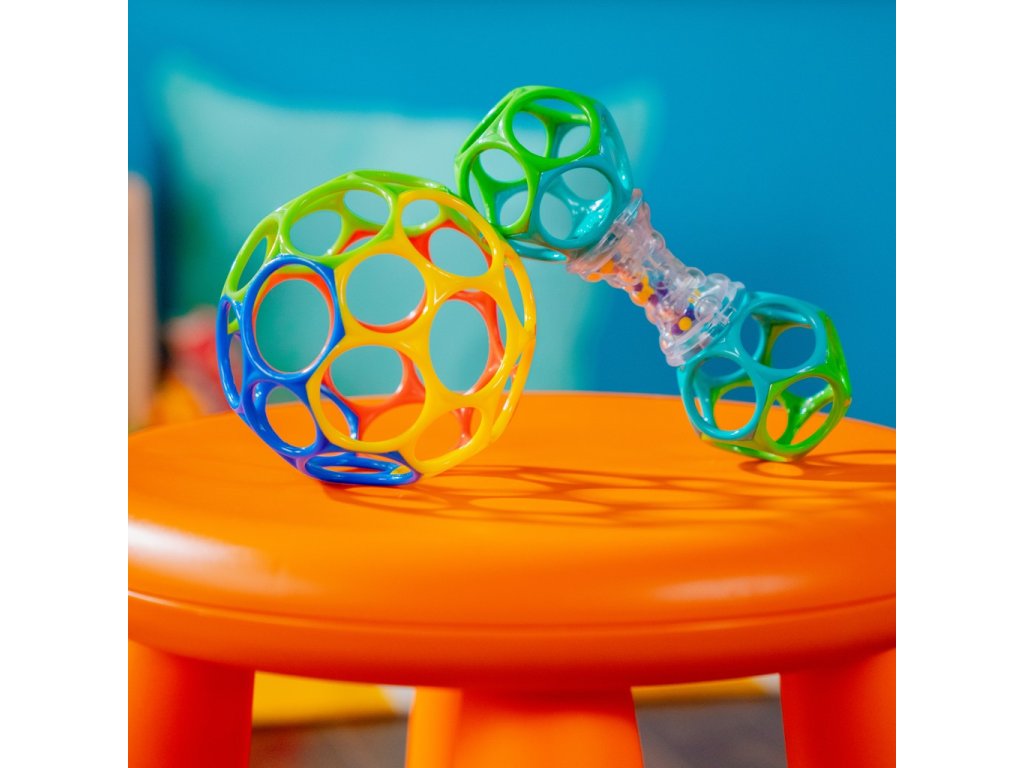 - Hračka Oball Shaker má průsvitnou, texturovanou rukojeť s barevnými korálky, které se uvnitř chrastí; součástí sady je i oblíbené červené Oball chrastítko