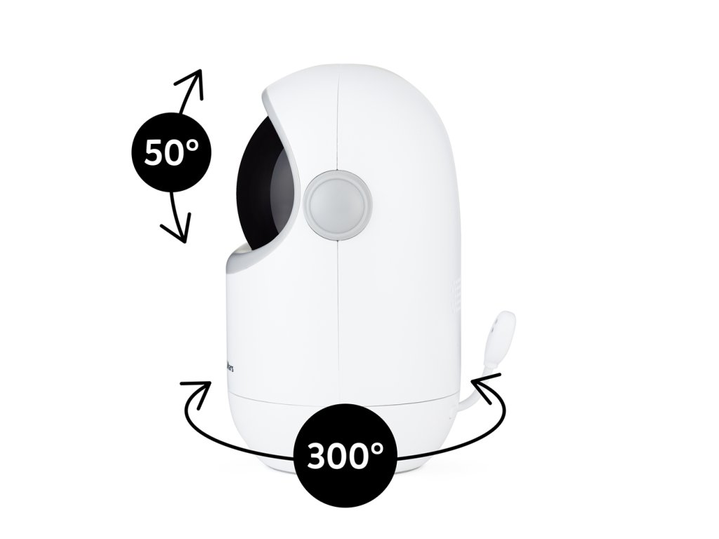 Kamera má široký rozsah pohybu: horizontálně až 300° (150° vlevo i vpravo), vertikálně 30° nahoru a 20° dolů. S úhlem záběru 68° tak máte dokonalý přehled o prostoru kolem postýlky či herní zóny.