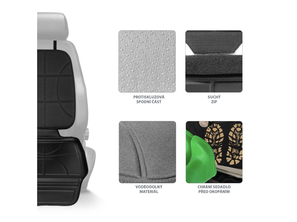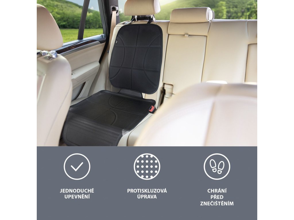 Užitečná polstrovaná ochrana pod autosedačku pomáhá chránit sedadlo auta před poškozením. Její protiskluzový materiál se postará o to, že ochrana sedadla drží pevně na svém místě. Tvarovaná spodní část zabraňuje šíření nečistot a okopání sedačky. Díky své velikosti poskytuje ochranu celému sedadlu.