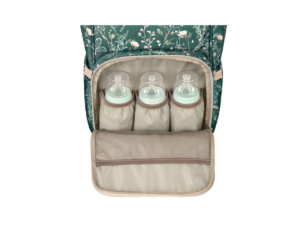 Uvnitř batohu najdete množství kapes a přihrádek i voděodolnou kapsu pro uložení vlhkých předmětů. Široký způsob otevírání batohu usnadňuje orientaci v uloženém obsahu. Na vnější straně najdete kapsy s uzavíráním na zip i kapsu pro uložení láhve. Termoizolační kapsy na láhve pomáhají udržet nápoje či mléko delší dobu v optimální teplotě. Součástí batohu je i přebalovací podložka.