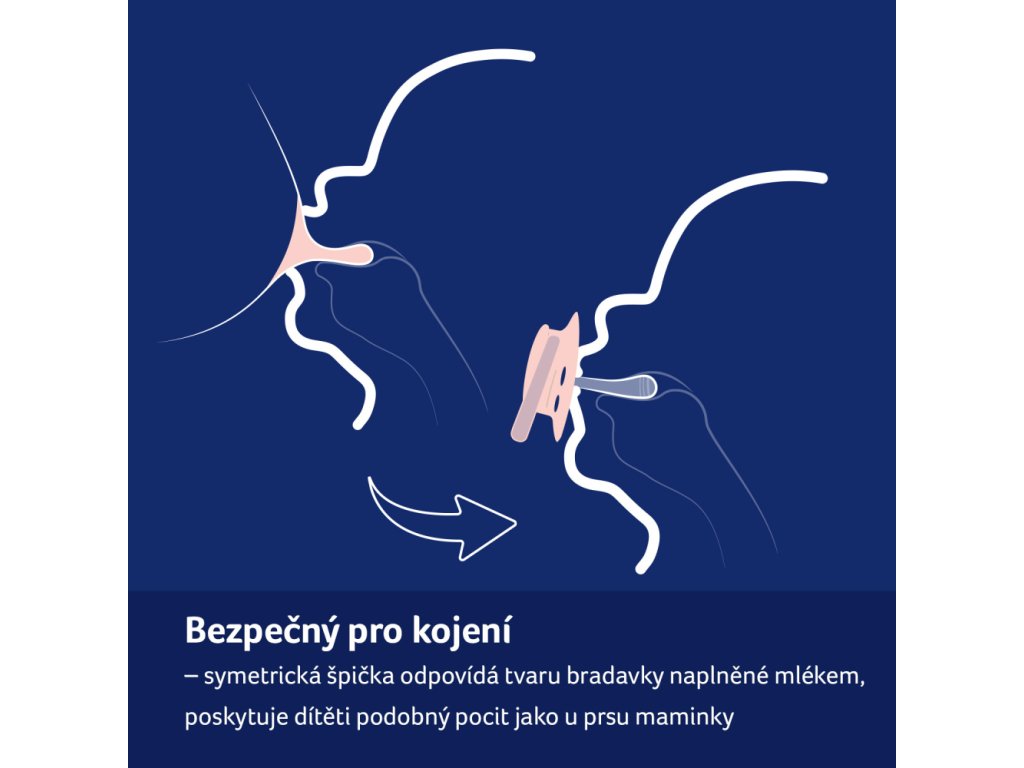 Symetrický tvar špičky vychází z tvaru bradavky naplněné mlékem, která poskytuje miminku známý pocit podobný pocitu z prsu.
