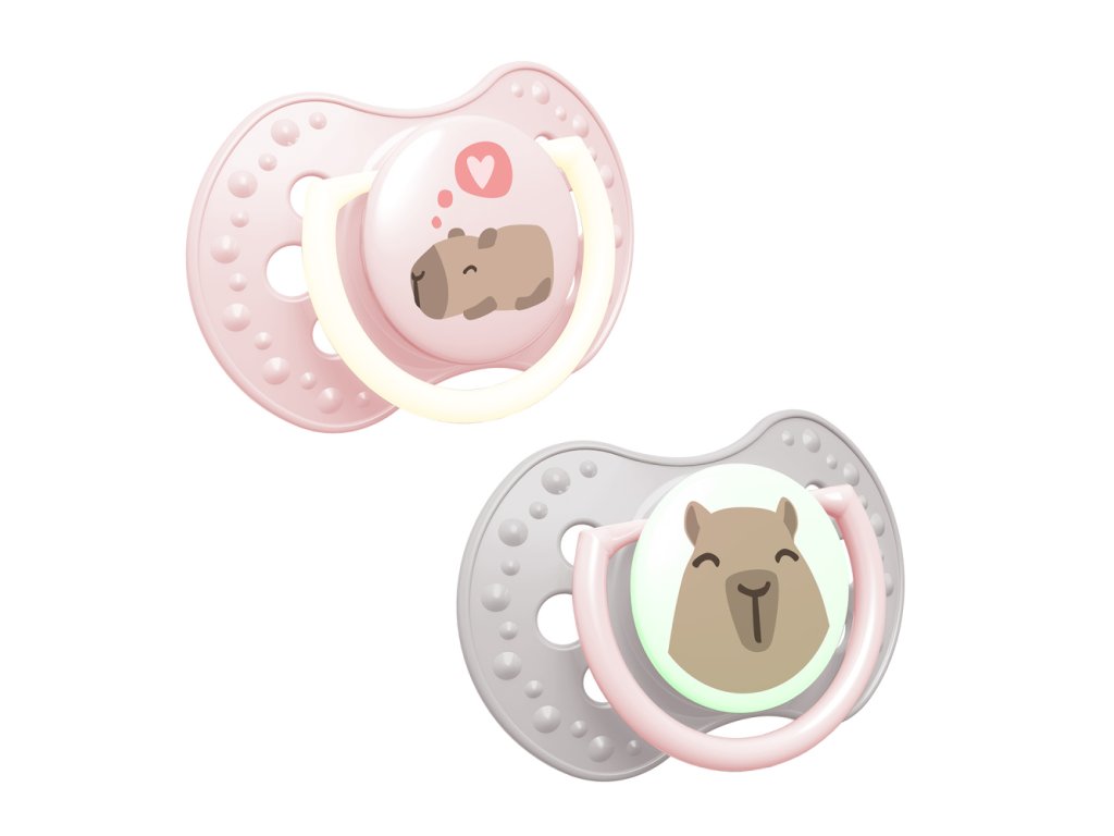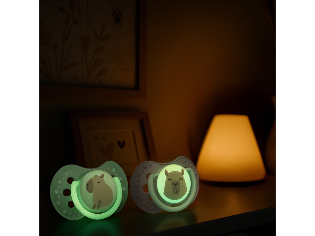 Úchytka u jednoho dudlíku a střed u druhého dudlíku svítí ve tmě, což usnadňuje jeho hledání v noci.