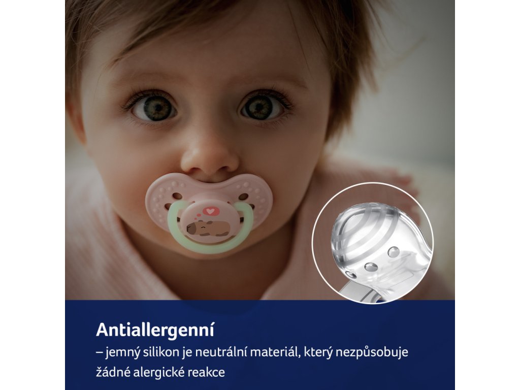 Jemný silikon v dudlíku je pro miminko neutrálním materiálem, nevyvolává alergické reakce, je bez chuti a zápachu, což je obzvláště důležité v této fázi, když je dítě citlivé na vnější podněty.