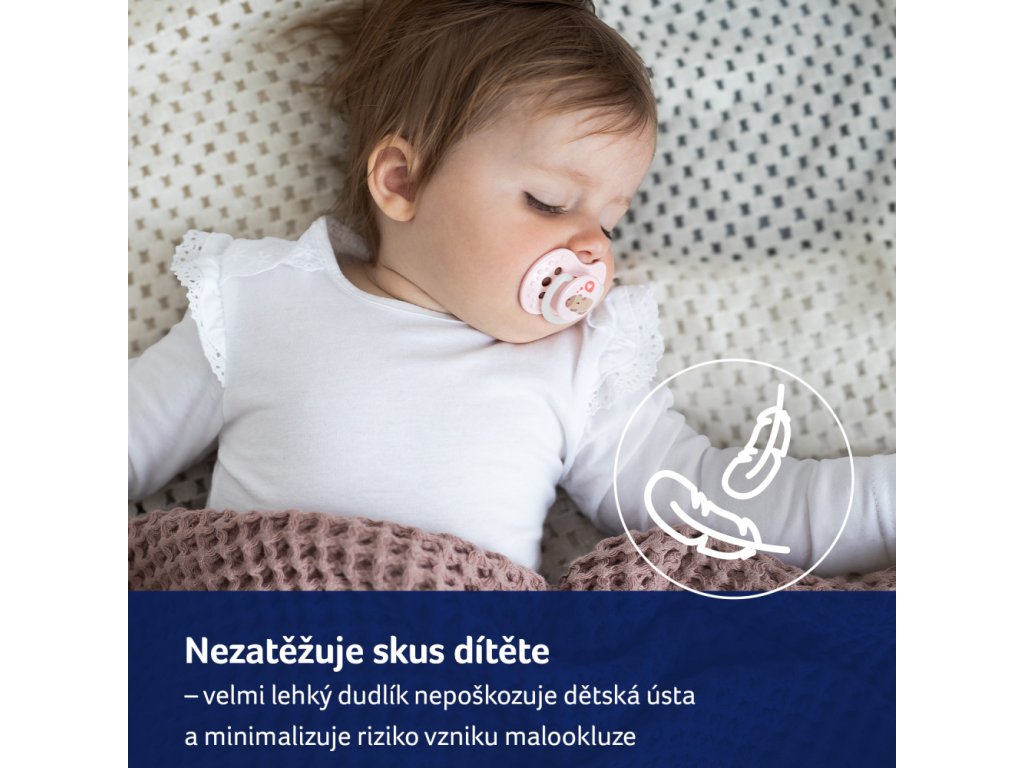 Velmi lehký dudlík, nezatěžuje skus dítěte a minimalizuje riziko vzniku malokluze.