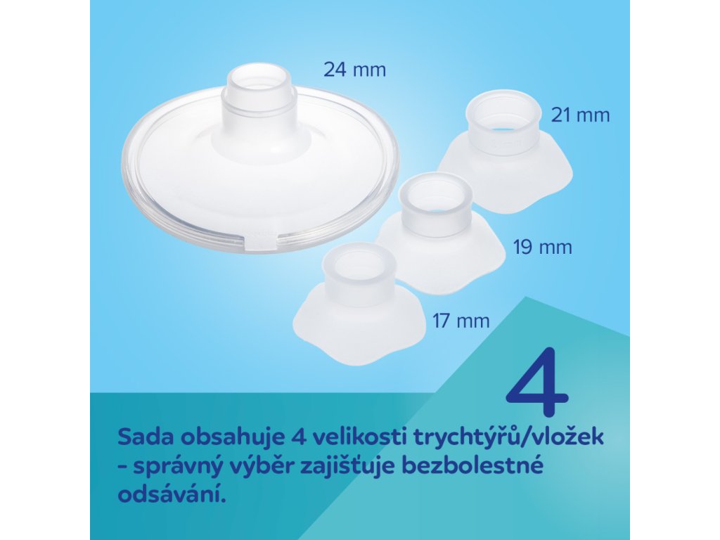 Vhodně tvarovaný silikonový trychtýř zajištuje bezbolestné odsávání mateřského mléka – jemný k bradavce, nevtahuje ji příliš hluboko. 4 velikosti trychtýře/vložek (17, 19, 21 a 24 mm) – správná volba velikosti pomáhá dosáhnout optimálního toku mléka.