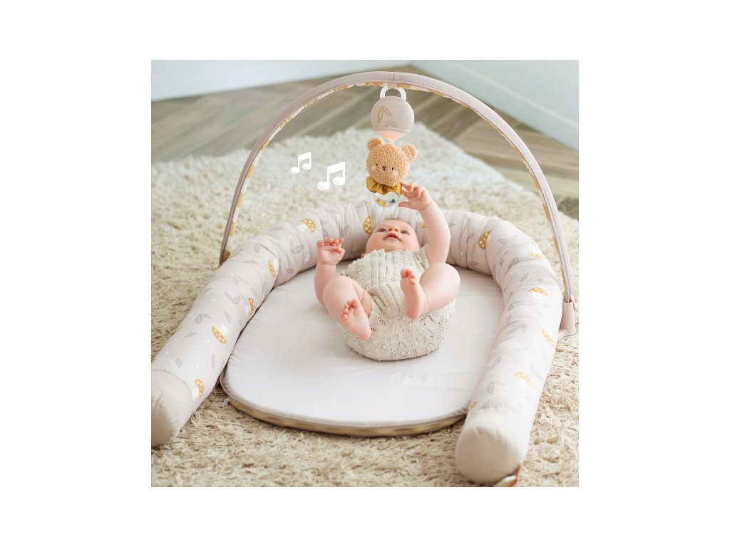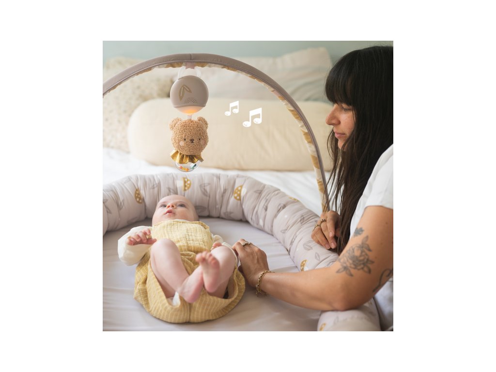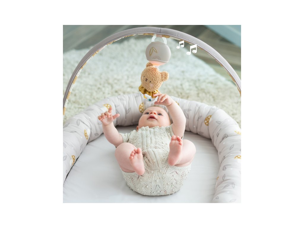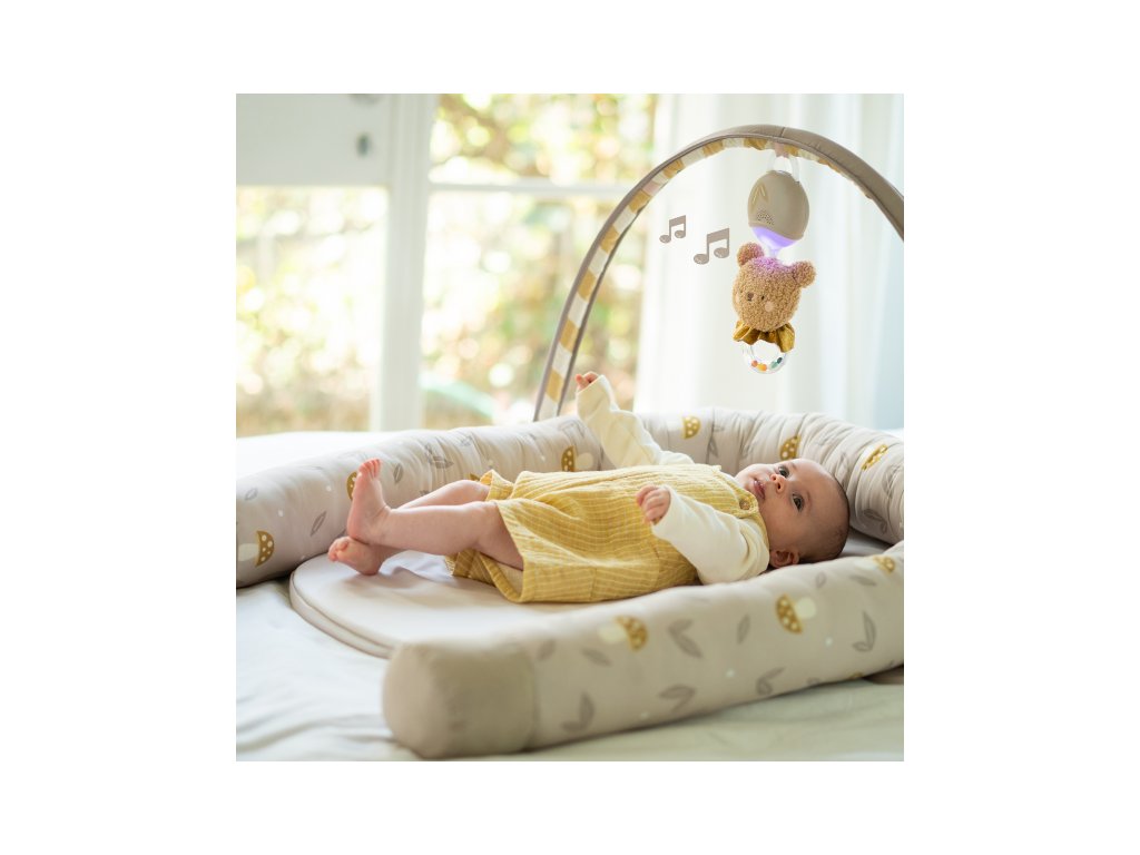 Součástí odnímatelné hrazdy je plyšový medvídek se světýlky a 22 minutami uklidňujících melodií, které pomáhají miminko zabavit i uklidnit.