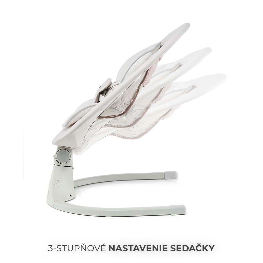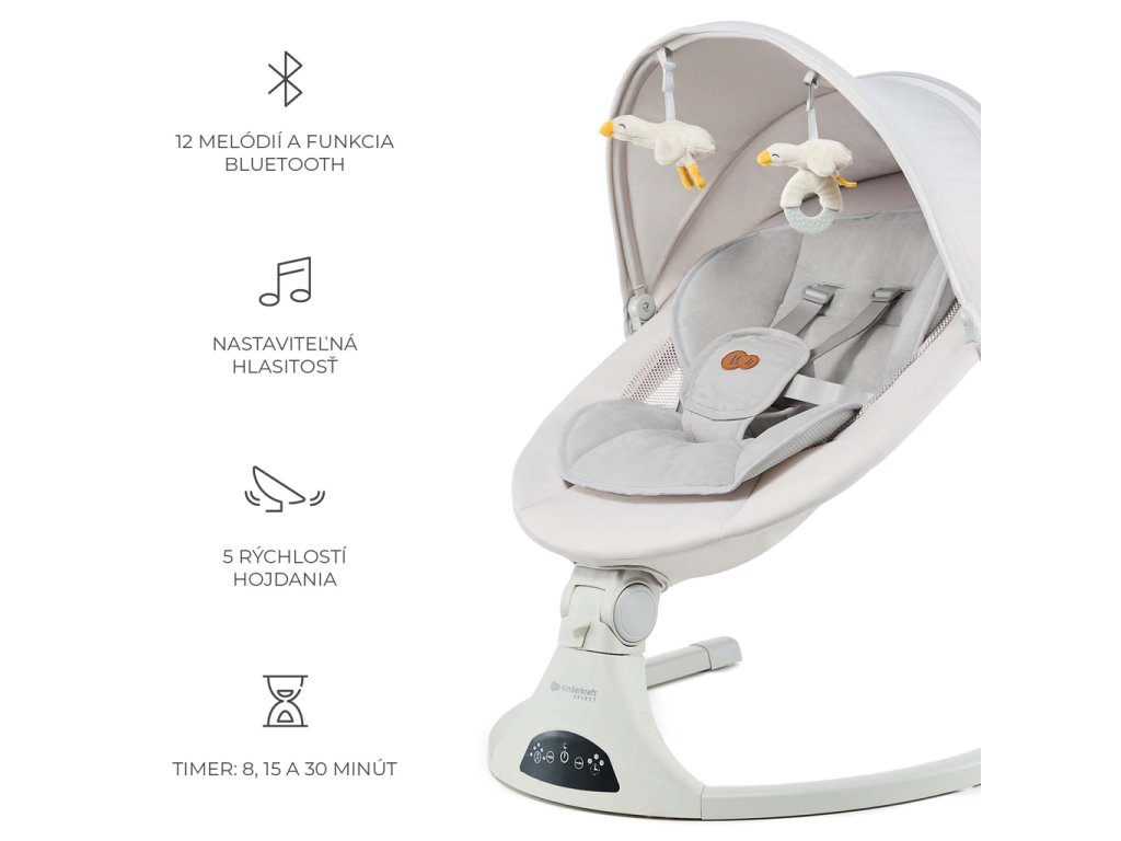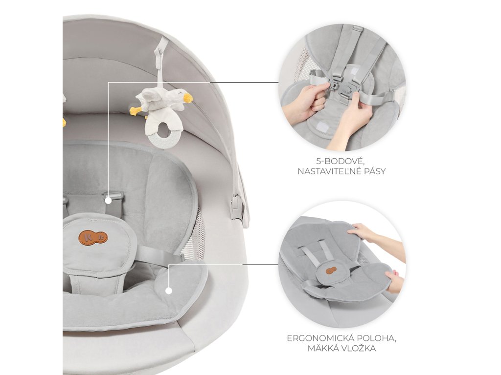 - Elektrické lehátko-houpací křeslo – automatické houpání v pěti rychlostech pro klidný odpočinek vašeho dítěte, časovač houpání lze nastavit na 8, 15 nebo 30 minut.
