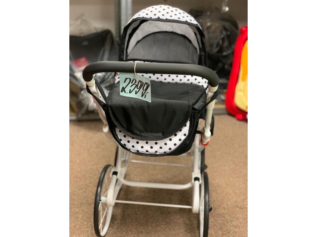 Velký kočárek pro panenky s bílou konstrukcí, madlem z ekokůže, houpací, velká kola.