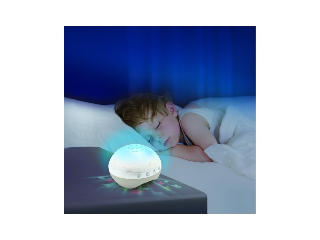Světelný projektor promítá na stěnu či strop hvězdičky a jemně tak osvítí dětský pokoj. Spolu s uklidňující melodií pomůže vašemu dítěti v klidu usínat. Nabízí na výběr z deseti uklidňujících melodií a zvuků přírody.