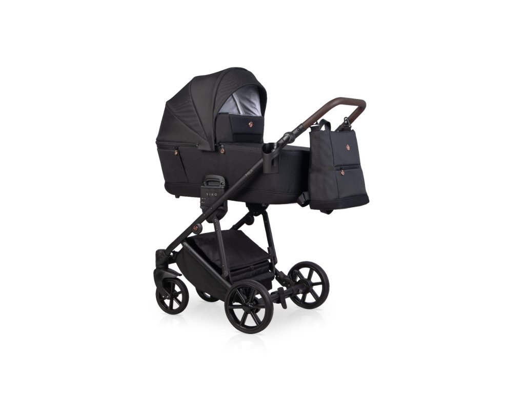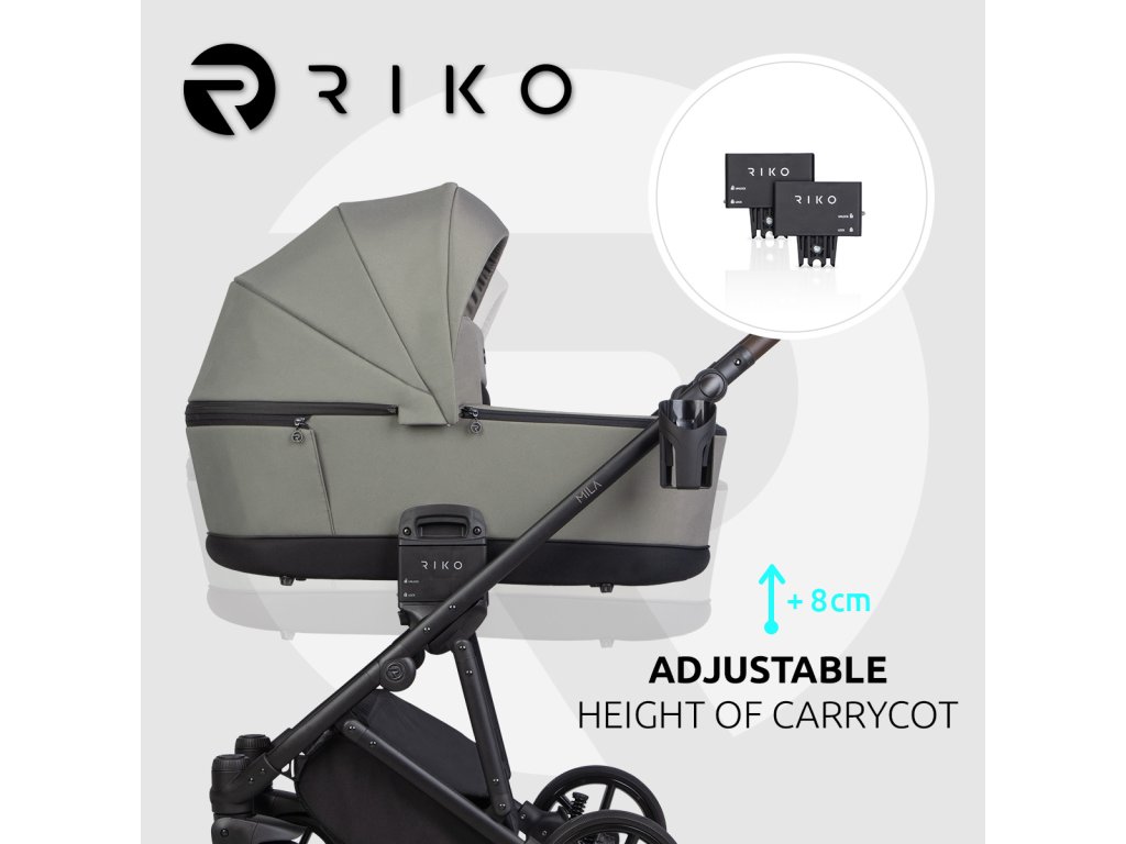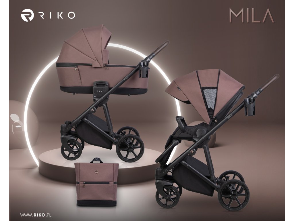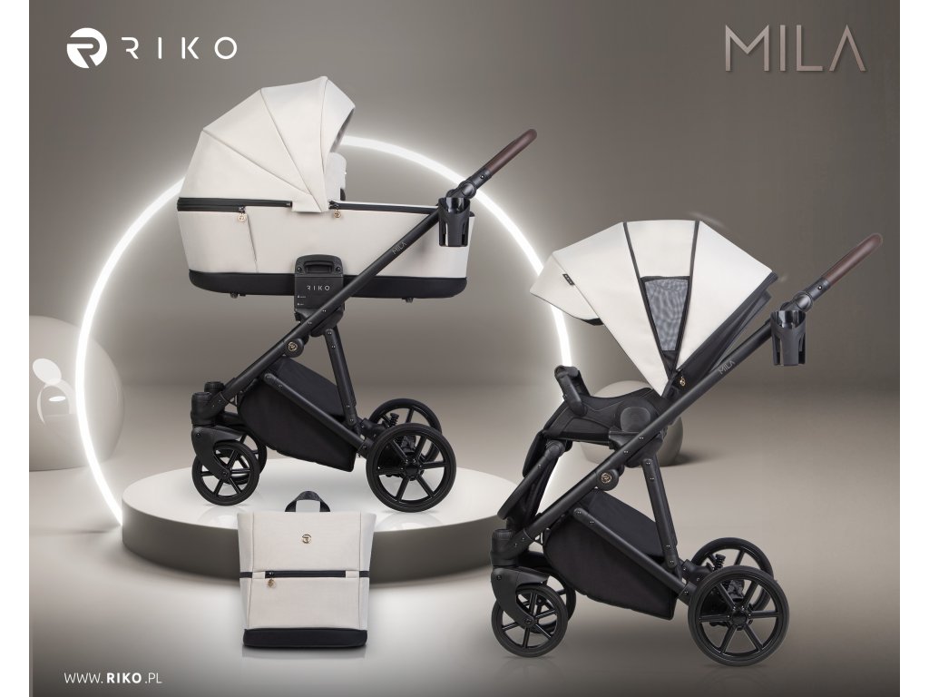 Kočárek RIKO MILA je dodáván se sedačkou, hlubokou korbičkou, adaptéry na podsedák, nánožníkem, pláštěnkou, moskytiérou, držákem na nápoje a módní a praktickou taškou v podobě městského batohu s úchytem na rukojeť kočárku.