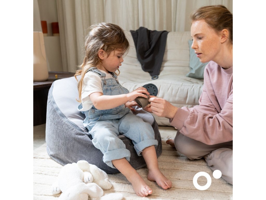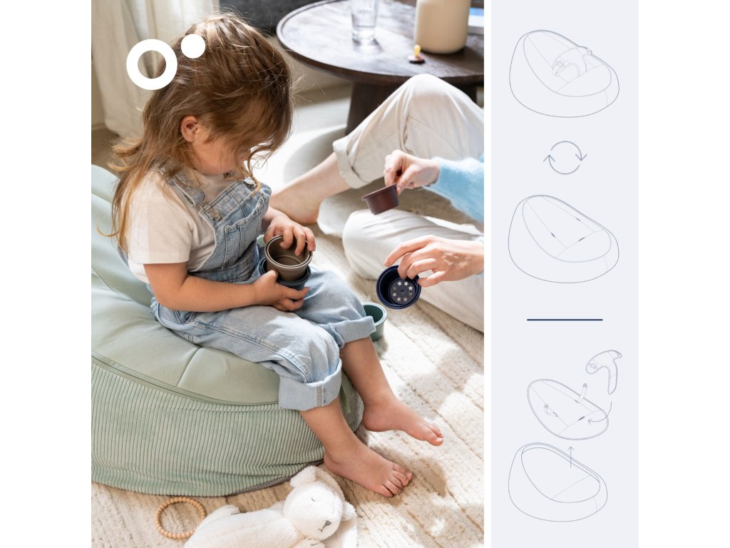 Používání je jednoduché – pro nejmenší děti je vybaven odnímatelným bezpečnostním pásem, později se snadno promění v pohodlný vak pro větší děti. Potah, horní vrstva i pás jsou snímatelné a pratelné (30 °C), výplň lze doplnit díky dostupným náhradním mikrokuličkám.
