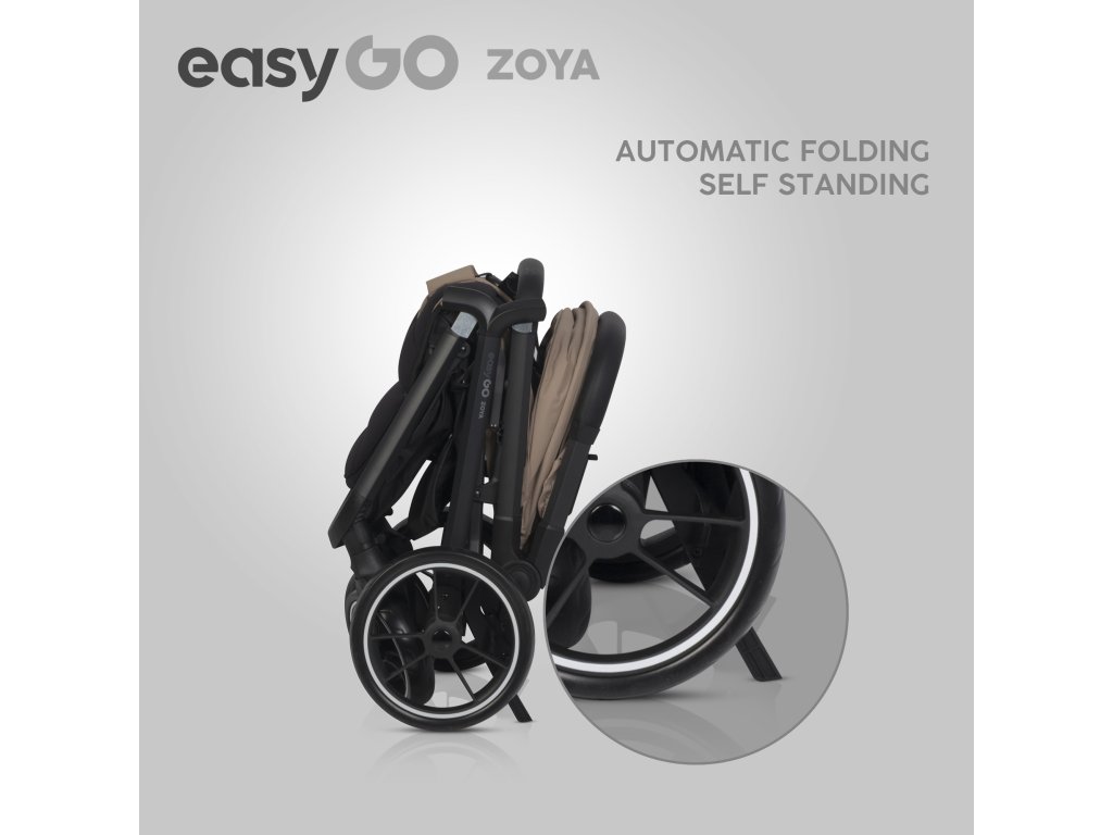 Kočárek EASYGO ZOYA je kočárek s automatickým skládacím systémem. Jednoduše uvolněte mechanismus na rukojeti a kočárek se automaticky složí do volně stojící polohy. Po složení získáte snadný přístup k madlu, které slouží i jako rukojeť pro přenášení. Díky tomuto skládacímu systému je ZOYA ideální volbou pro aktivní rodiče, kteří kočárek často skládají a přepravují v autě. Přenášení složeného kočárku do schodů a dolů je také snadné. Kočárek ZOYA váží pouhých 8,2 kg a skládací systém DUAL FOLD umožňuje složit kočárek do velikosti malé krychle. Je také skvělým společníkem na dovolené, protože je dodáván s přepravním vakem, pláštěnkou a nánožníkem.