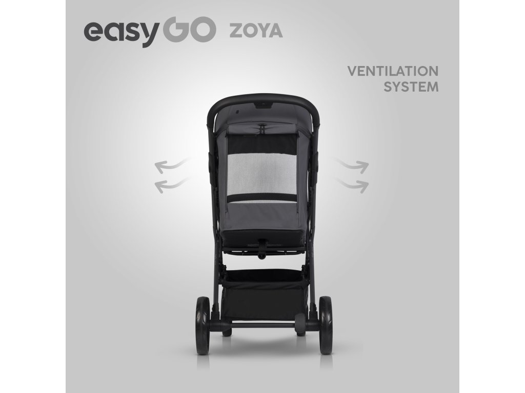 Navzdory nízké hmotnosti a malým rozměrům ve složeném stavu se ZOYA vyznačuje velkým a pohodlným sedadlem určeným pro děti do 22 kg (nebo do 4 let). Sluneční stříška je upevněna vysoko nad opěradlem (až 66 cm nad povrchem sedáku) a opěrka nohou umožňuje snadný přístup k plastovému schůdku pro starší děti. Opěradlo se dá nastavit ze sedu do plně sklopené (spací) polohy. Nastavení opěrky nohou umožňuje polohu pro spaní a plně sedící polohu s přístupem k plastovému schůdku pro starší děti.