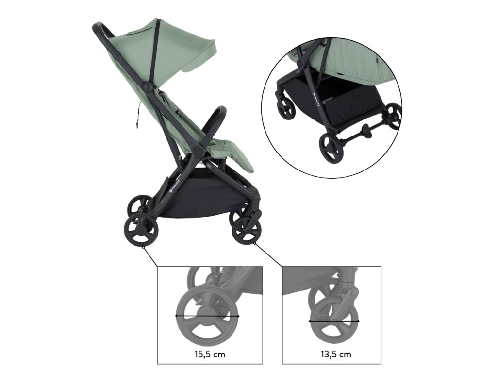 Odpružená PU kola (přední s možností otočení o 360°; přední 13,5 cm, zadní 15,2 cm) zajišťují plynulý pohyb ve městě i v mírném terénu.
